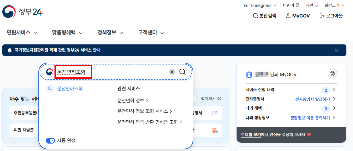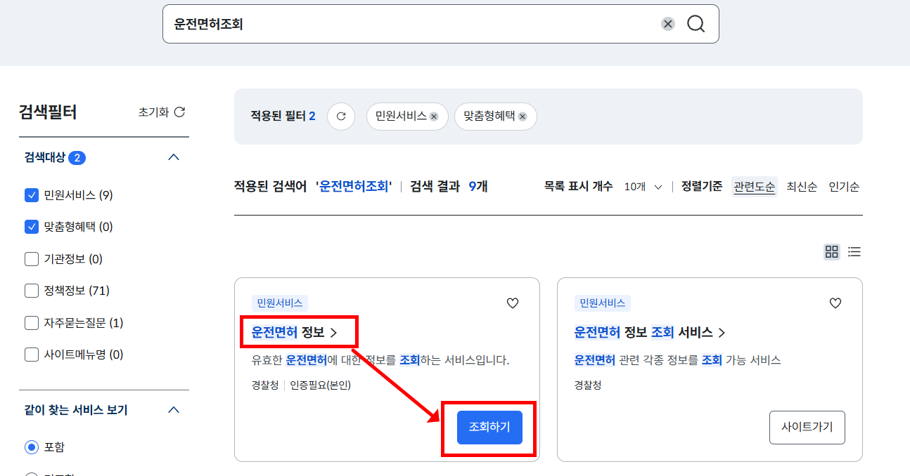 로그인을 하고 나서 검색하는 창에 운전면허조회 라고 쳐 보세요
