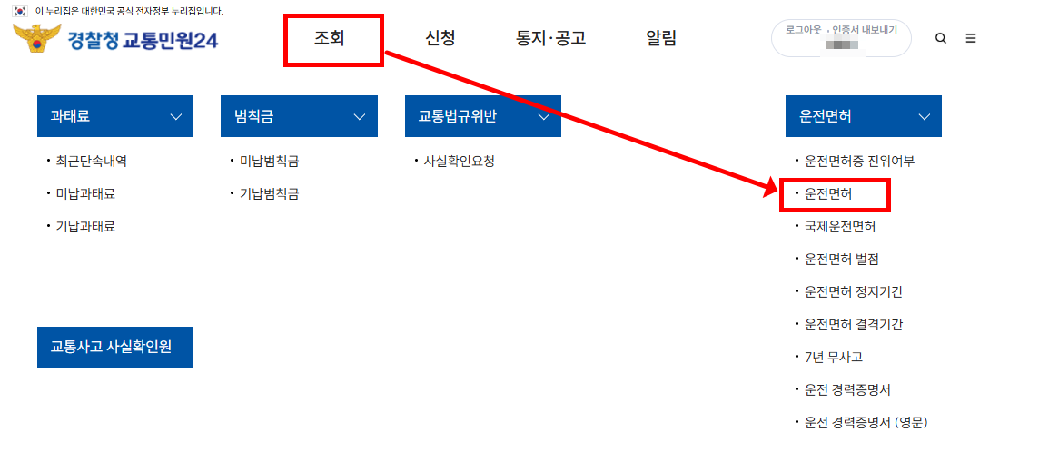 로그인하고 나서 메인 메뉴에 조회를 누르면 오른쪽에 운전면허 란이 뜨는데요 여기서 "운전면허"를 선택합니다.