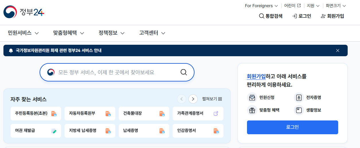 정부24에 들어가서 로그인을 먼저 해주셔야 합니다.