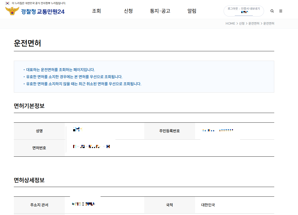 그러면 바로 운전면허 기본정보랑 상세정보 페이지가 뜨기 때문에 확인이 가능합니다.