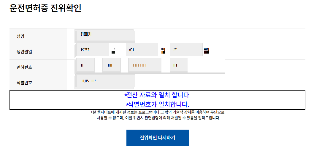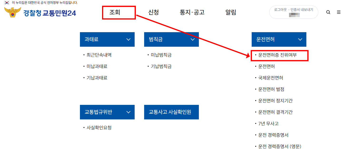 로그인 하시고 나서 조회를 눌러보면 오른쪽에 운전면허증 진위여부가 있습니다.