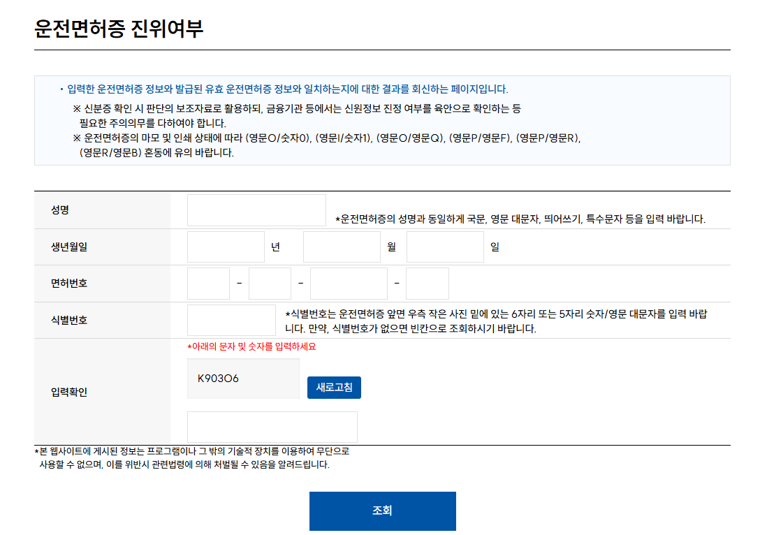 진위여부 들어가시면 아래와 같이 정보입력 하는게 나오니, 운전면허증 보고 입력해 주세요.