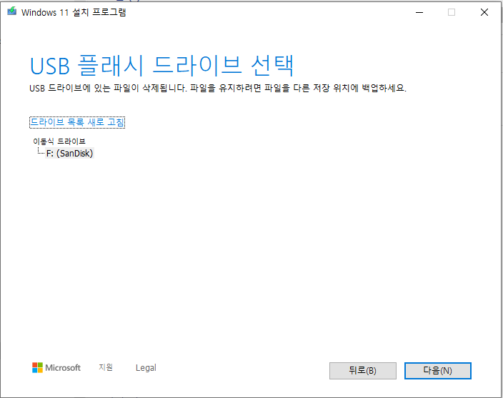 목록에서 설치에 사용할 USB 메모리를 선택하고 ‘다음’을 클릭합니다.