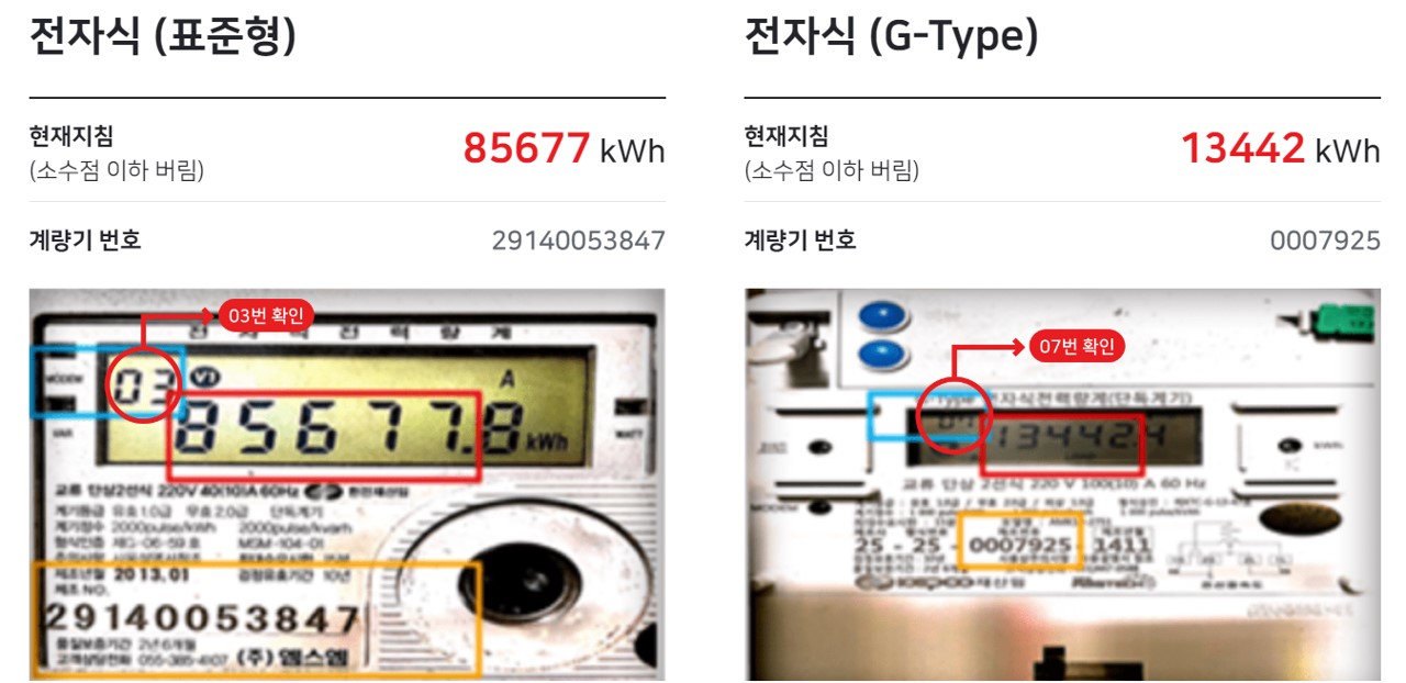 모든 계량기는 기계식과 전자식의 형태를 갖고 있는데요, 전자식은 또 표준형과 G-type, E-type 등으로 나누어 집니다. 각자 살고 계신 곳의 계량기 형태를 잘 살펴보시고 해당되는 계량기에서 사용량을 확인하시기 바랍니다.