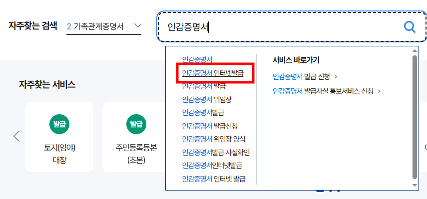 - 정부24 웹사이트에 접속하여 '인감증명서 발급'을 검색합니다. 찾아보기 힘드신 분은 아래 링크로 들어가세요.