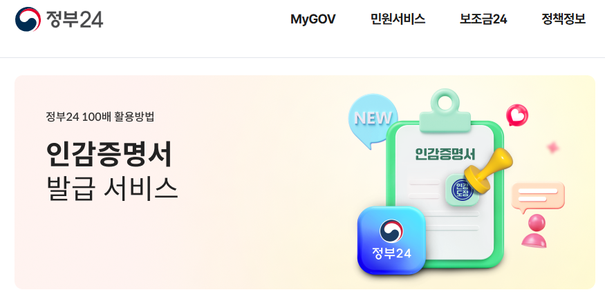 - 정부24 웹사이트에 접속하여 '인감증명서 발급'을 검색합니다. 찾아보기 힘드신 분은 아래 링크로 들어가세요.
