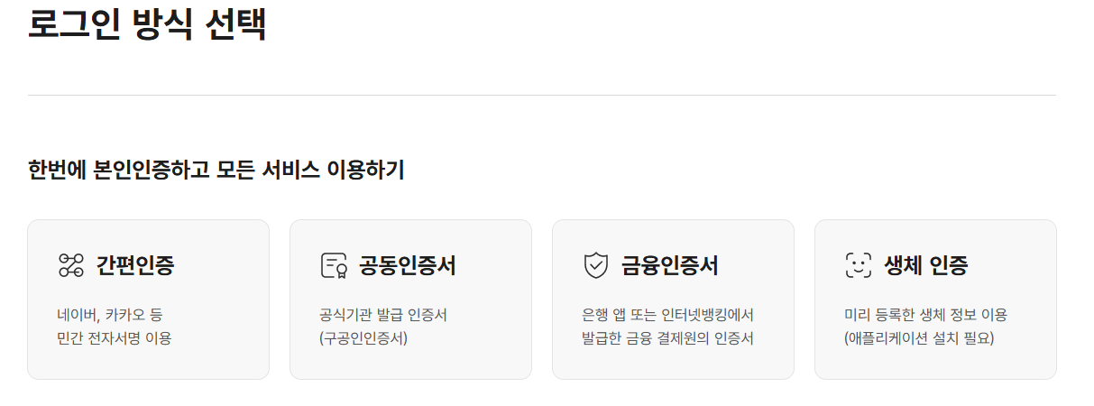 | 필요 서류 | 본인 인증 (공동인증서) | 신분증, (대리인 신청 시 위임장 필요) |