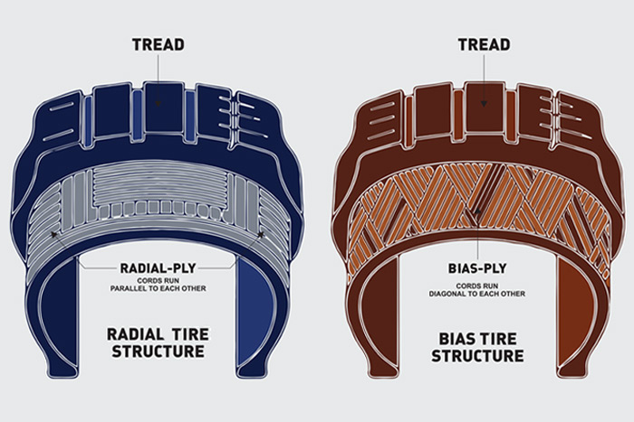 ✅ 래디얼 타이어는 내부 섬유층이 아래 이미지 왼쪽처럼 원주방향에 수직으로 배치되어 있습니다.