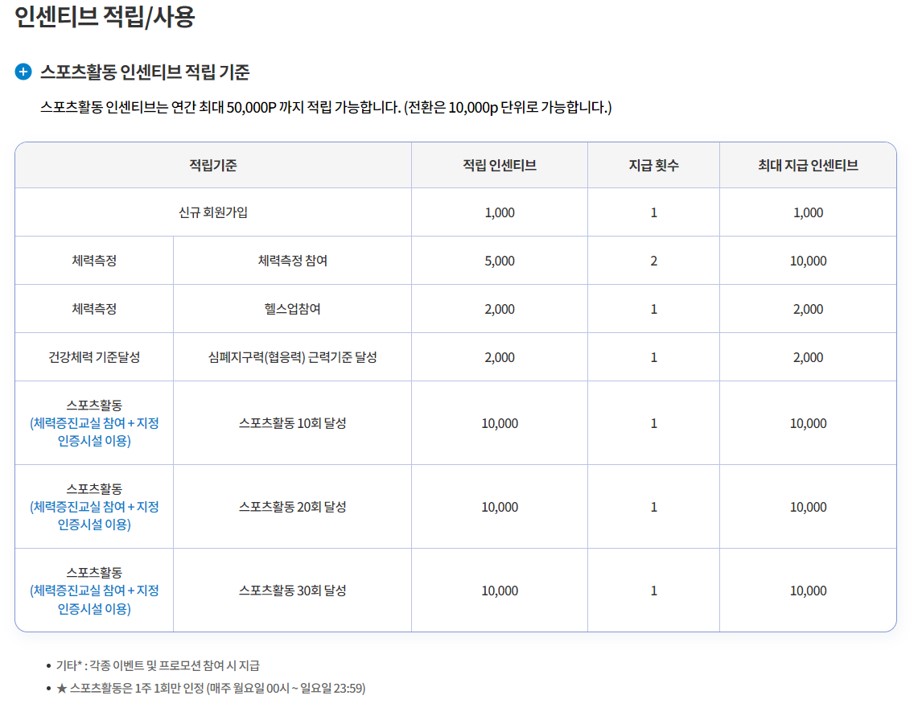 스포츠활동의 인센티브는 연간 최대 50,000포인트까지 적립이 가능합니다.
