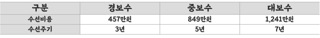 자가 가구의 보수 한도액도 아래와 같이 주택 노후 정도에 따라 최소 457만원에서 최대 1,241만원까지 보장합니다.