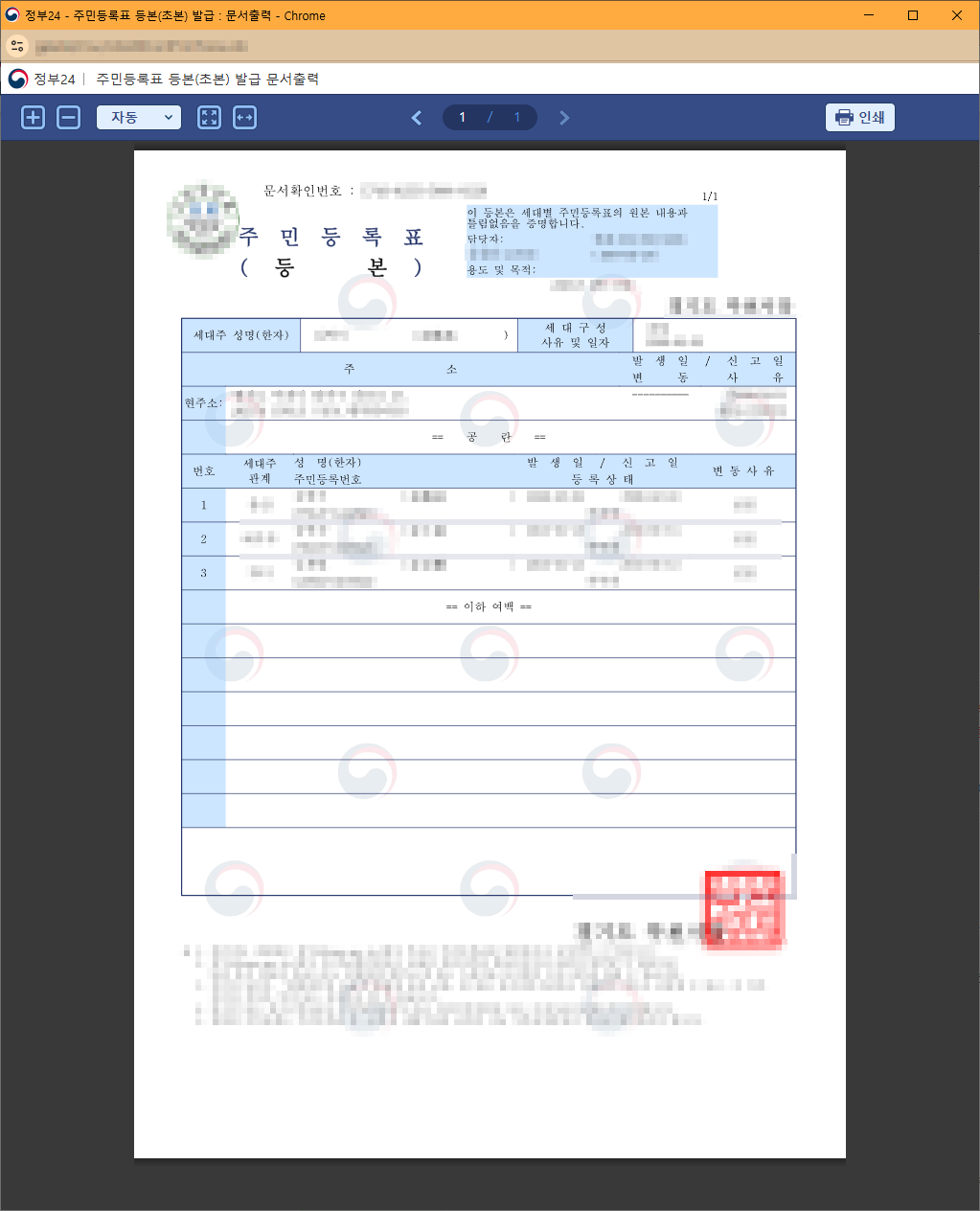 문서를 클릭하고 나면 주민등록등본이 인쇄 대기 상태로 나타나는데요, 저는 직접 출력을 위해 인쇄를 눌렀습니다.