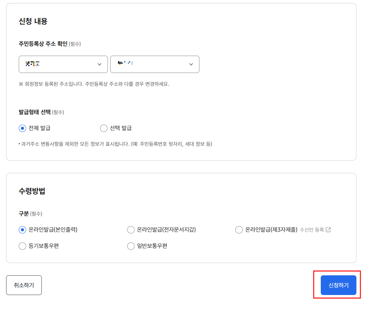 전체발급을 선택하면 주민등록번호 뒷자리랑 세대 정보가 모두 나오기 때문에 제출할 기관이 요청하는 데로 상황에 맞게 선택하시면 됩니다.