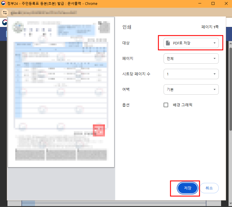 그러면 실제로 프린터로 출력을 할 지, 아니면 전자파일인 PDF 파일로 저장할지 선택할 수 가 있는데요, 저는 PDF로 저장을 눌러서 PC에 저장한 다음 프린터로 출력했습니다. 이 부분은 편하신 데로 하시면 됩니다.