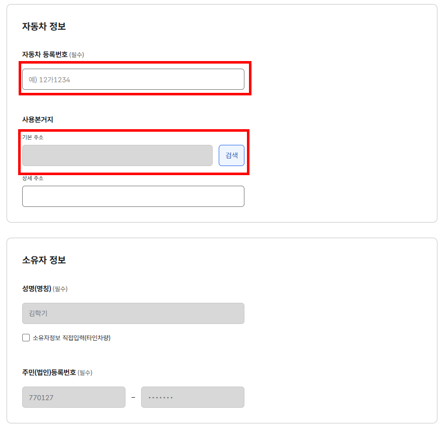 발급하기 들어가면 아래와 같이 정보 입력란이 나오는데요, 자동차 번호판 번호랑 주소는 입력하셔야 합니다.