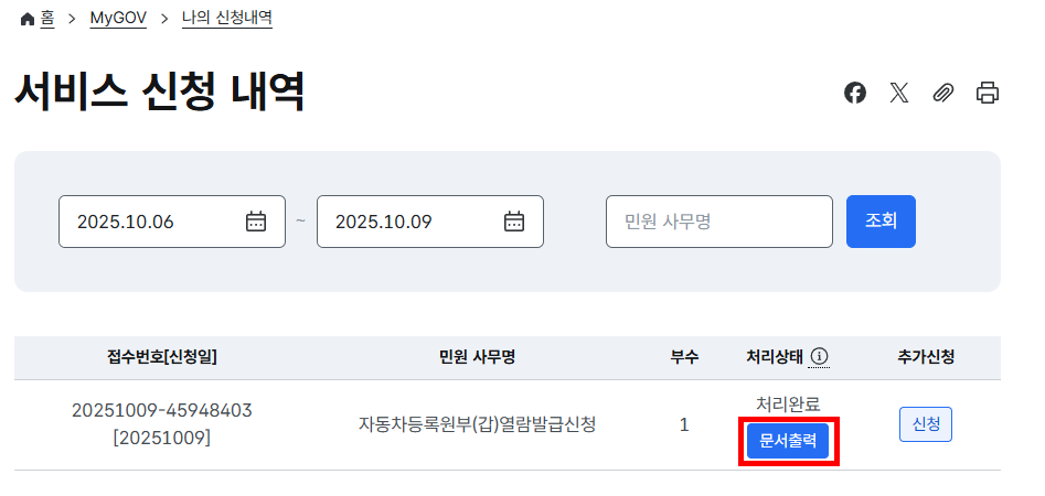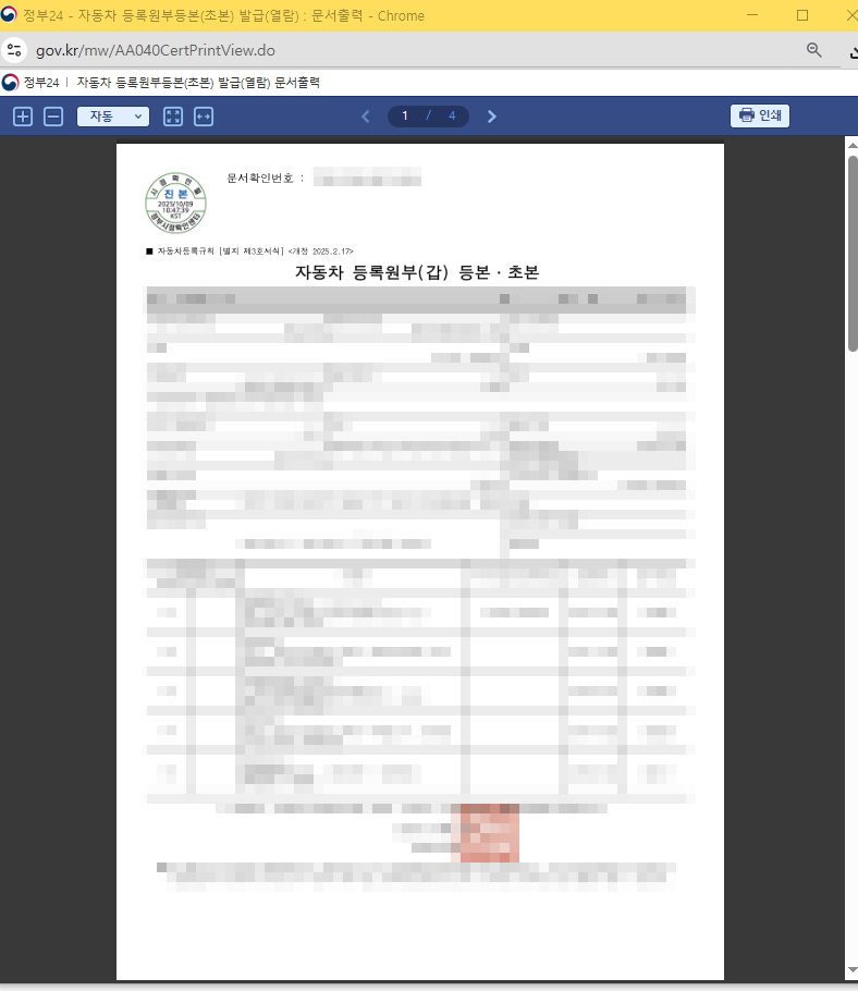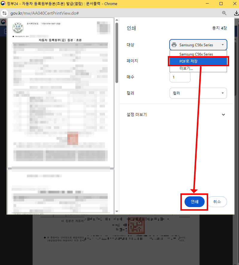 문서출력 클릭하시면 별도의 인쇄 창이 나타납니다.