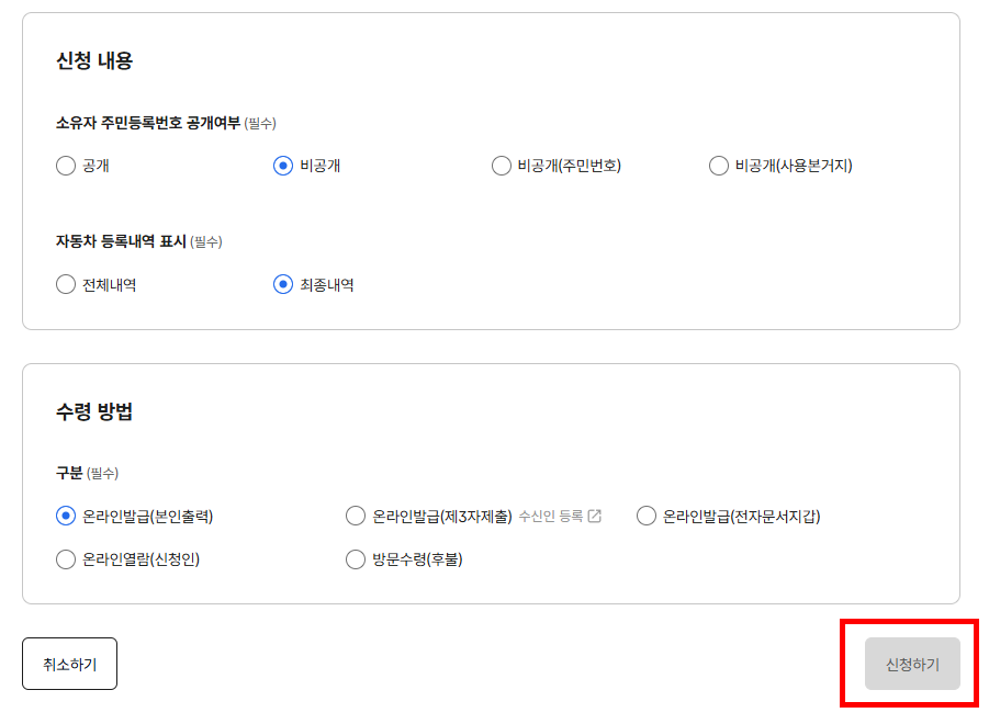 주민등록번호 공개 여부는 상황에 맞게 선택하시고, 온라인으로 발급하는 거니까 수령방법은 온라인 발급 (본인출력) 으로 해주세요. 그리고 신청하기 누릅니다.