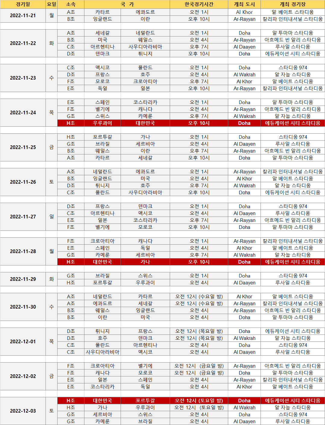 | 11월24일 (목) | H조 | 대한민국 : 우루과이 | 오후 10시 | Doha 에듀케이션 스타디움 |
