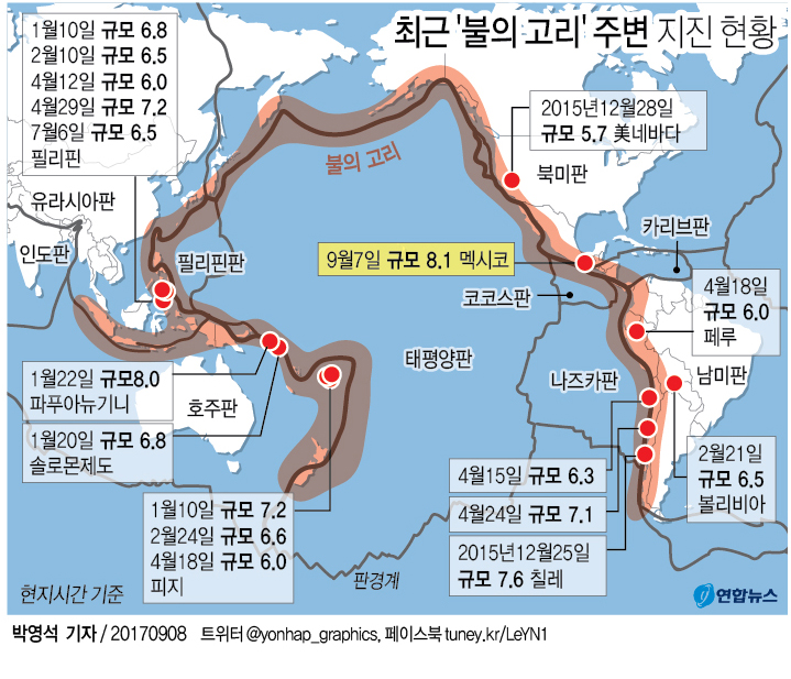 지각판이 만난다는 부분에서부터 지진이 자주 일어나겠다는 생각이 드는 지역입니다.