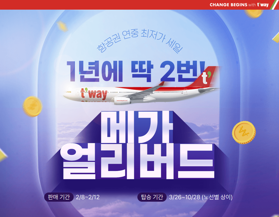 티웨이는 1년에 딱 2번 메가 얼리버드를 진행하고 있는데요, 이때가 1년중 가장 낮은 가격으로 항공권을 판매하는 시기입니다.