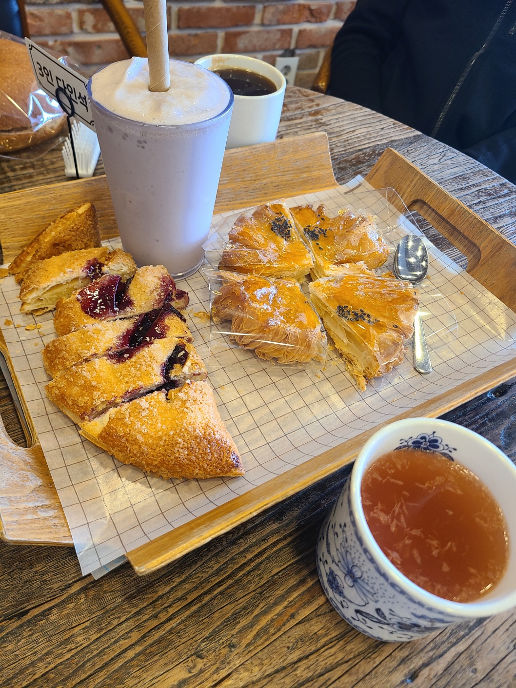 내려와서 주문해 놓은 커피와 빵을 들고 테이블로 돌아가 여유롭게 마시며 그 시간을 즐겼습니다.