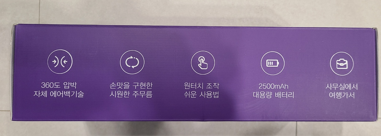 아무래도 강하게 모터를 돌려서 공기를 압축시켜야 하니까 전력소비가 많을것 같은데요, 이 모델은 고성능 2500mAh 배터리를 사용하고 충전도 C타입이라서 너무 간편하고 연속 안마도 가능할 정도로 배터리 용량의 부족함을 못 느꼈습니다.