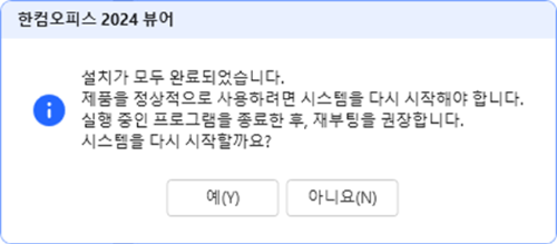(11) 설치 후에는 시스템 재부팅을 물어보는데, 굳이 재부팅 바로 안해도 되니까 아니요 눌러서 진행해도 문제 없습니다.