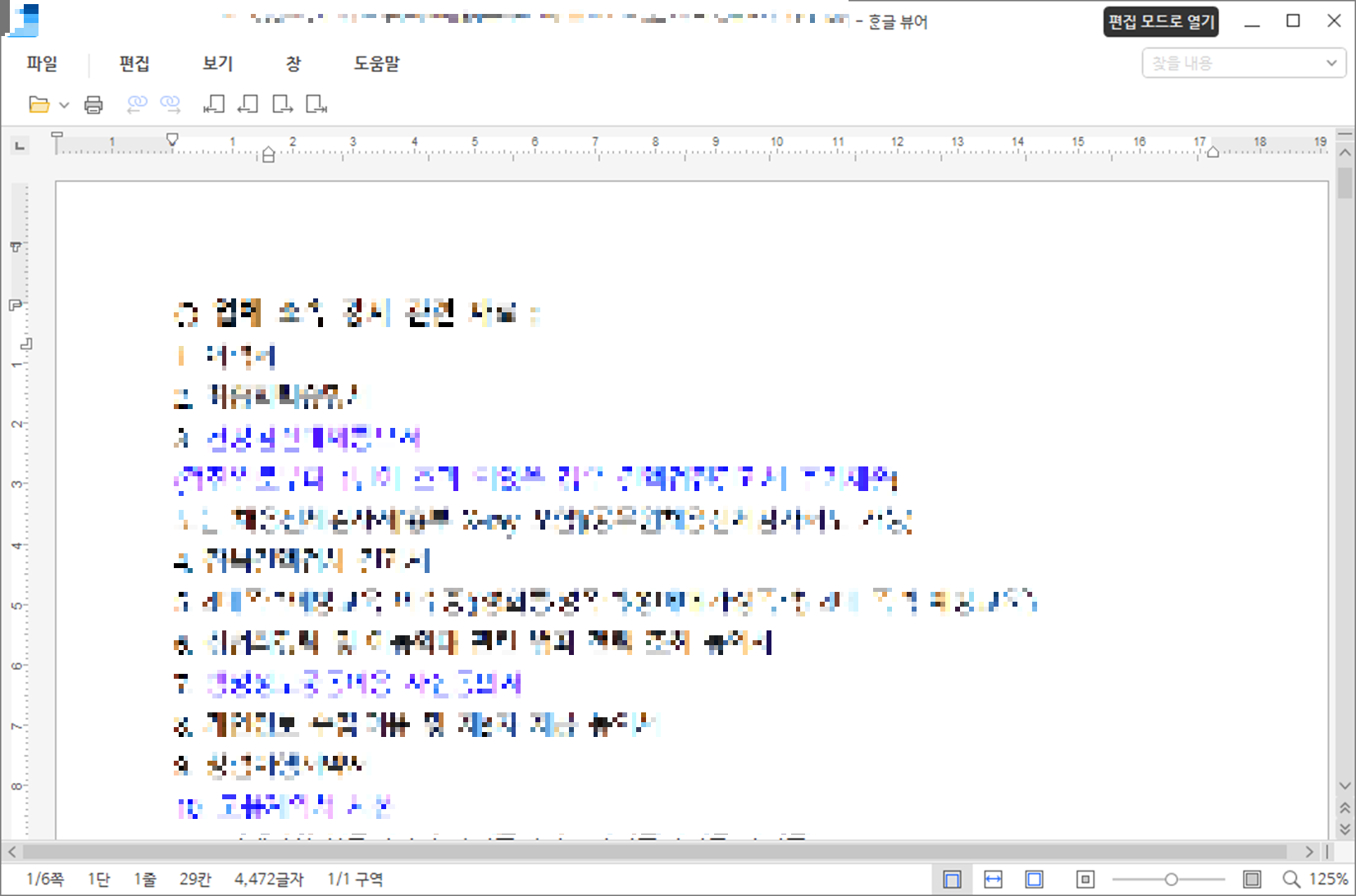열람하려는 HWP 파일을 선택하여 열면 문서를 확인할 수 있습니다.