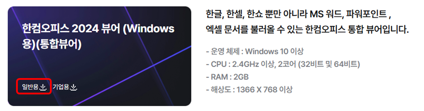 다운로드 센터에 들어가시면 추천 다운로드 항목중에 가장 위에 있는 것이 바로 한글뷰어인데요, 한컴오피스 2024 뷰어라고 되어 있을 겁니다.