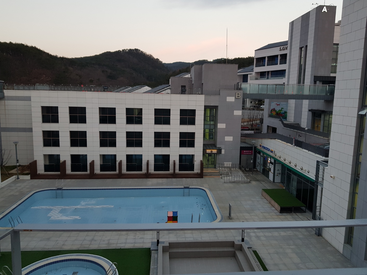 건물 중앙에느 야외 수영장이 있는데 지금은 겨울이라서 운영을 하지는 않습니다.