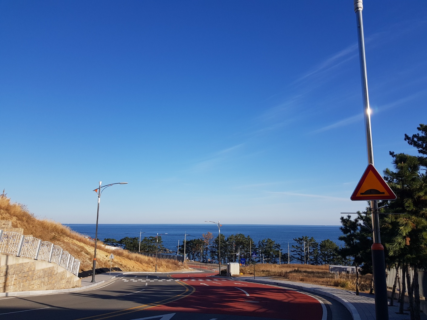 직접 와서 보니 며칠 밤 부담 없이 지내기에 너무 좋을듯 한데요, 한적한 동해안로를 따라가다가 좌회전을 하면 넓은 오르막길로 호텔이 이어집니다. 올라가는 길을 뒤돌아보니 동해바다가 정말 시원하게 펼쳐져 있어서 그냥 산책을 나와서 바다를 구경해도 너무 좋을듯 해요.