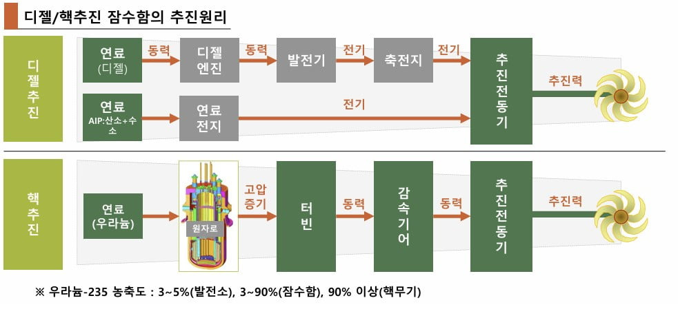 반면 핵잠수함(Nuclear Submarine)은 원자로(reactor)에서 나오는 열을 이용해 증기를 만들고, 그 증기로 터빈을 돌려 추진력을 얻습니다. 즉, ‘핵연료’를 사용합니다.