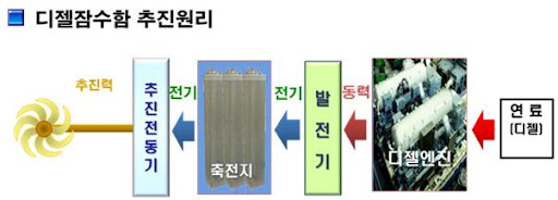 - 디젤 잠수함: 연료 = 디젤유, 에너지 저장 후 전기모터로 추진