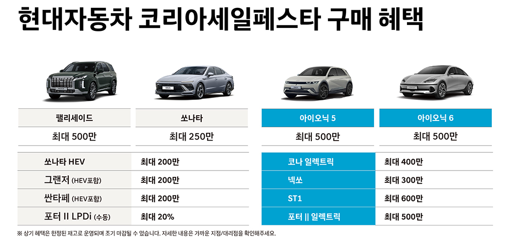 현대자동차 관계자는 “국내 최대 쇼핑 축제인 2024 코리아 세일 페스타를 맞이해 올해 최대의 할인 혜택을 마련했다”며, “국민들의 성원 덕분에 대한민국을 대표하는 수출기업이자 글로벌 브랜드로 성장한 현대자동차는 앞으로도 고객들에게 보답하기 위해 최선을 다할 것”이라고 밝혔습니다.