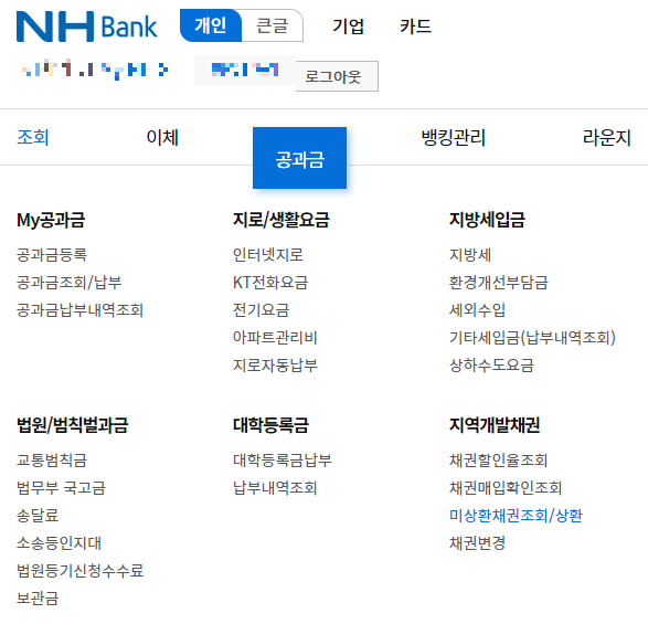 홈페이지 접속하게 되면 위의 상단 메뉴중에서 공과금이라는 곳을 들어가 미상환채권조회/상환 이라는 항목을 찾아 가시면 됩니다.