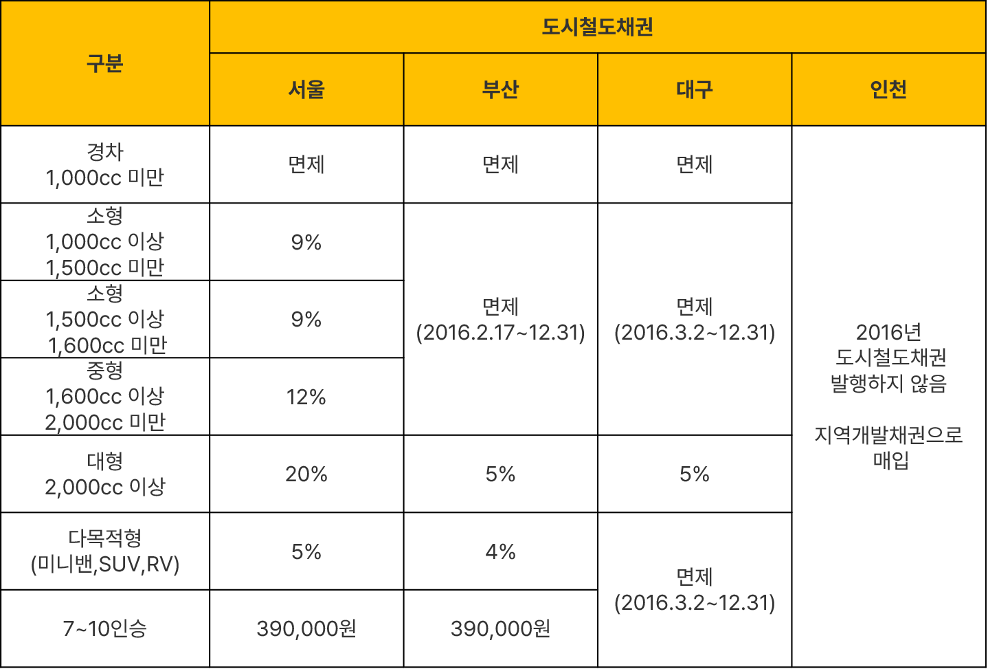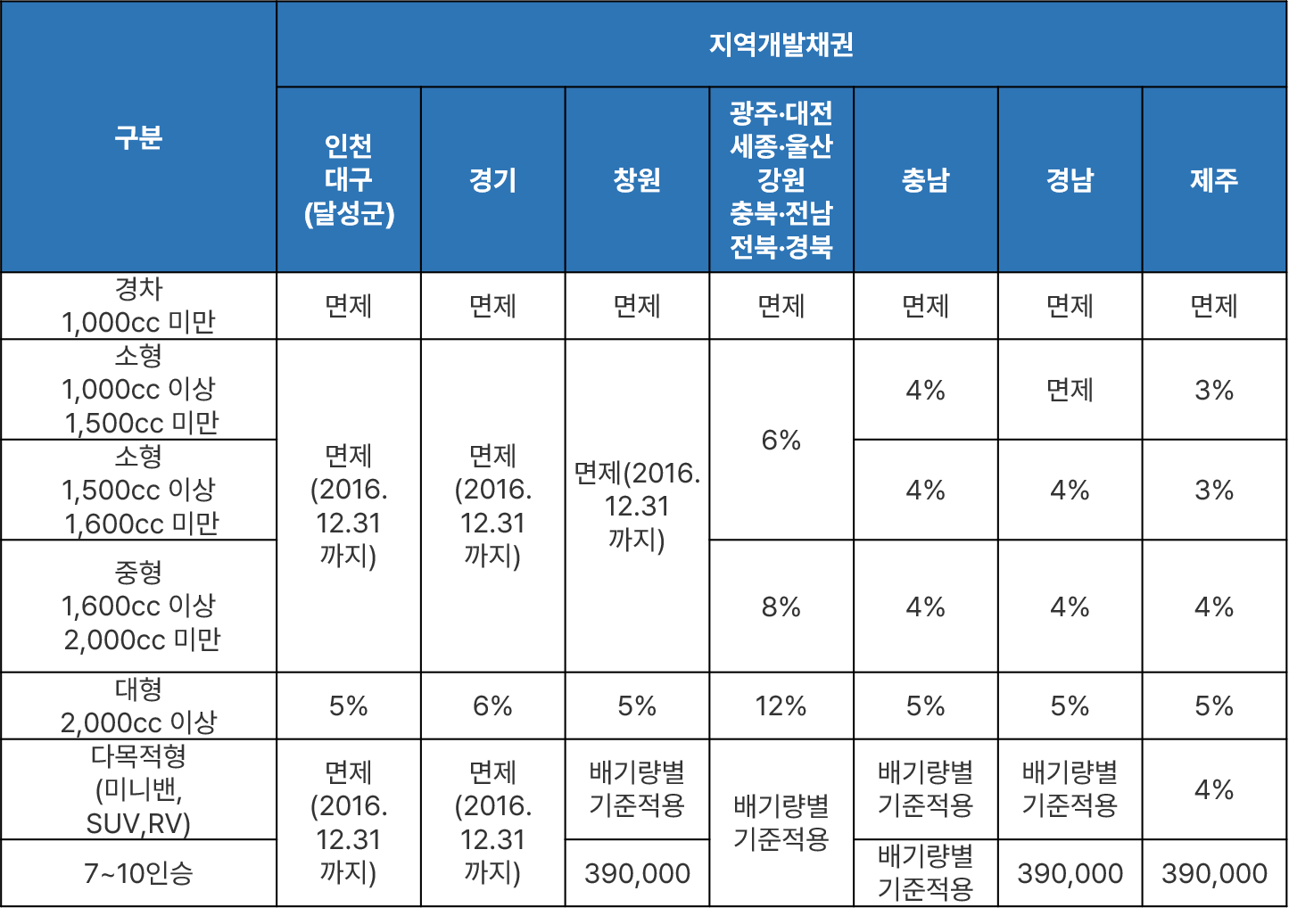이 지역개발채권이라는 것은 그 지역의 지역개발사업 자금을 조달하거나 복리를 향상시키기 위해 지자체가 발행하는 것인데요, 따라서 구입한 자동차의 배기량이나 등록시기에 따라 그리고 어느 지역에 등록시키냐에 따라 채권의 종류와 비율이 달라지게 됩니다.