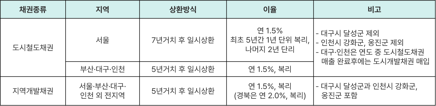 전국적으로 각 지역은 도시철도채권 과 지역개발채권 2 가지중에 선택해서 채권을 발행하고 있습니다.