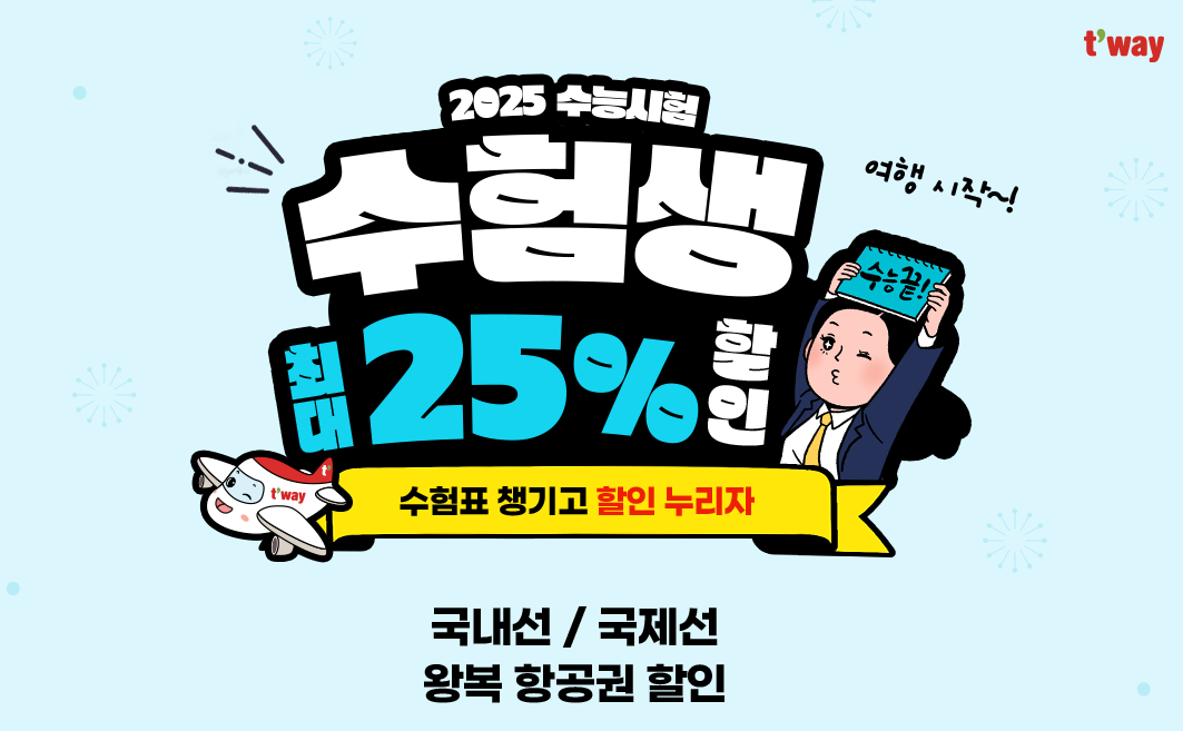 수능 이후 여행을 계획하는 수험생이 많아지면서 항공사들의 할인 이벤트도 큰 관심을 받고 있습니다. 올해는 특히 티웨이항공의 혜택이 넓고 조건도 명확해 활용도가 높습니다.