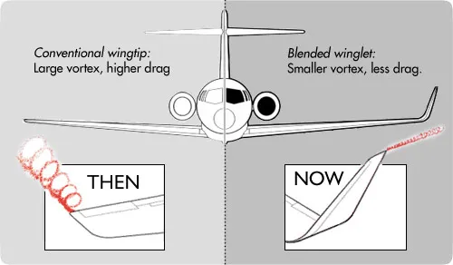 공기역학적 용어 중에 비행기의 날개끝에서 소용돌이가 만들어지면서 작용하는 항력중에 유도항력이라는 것이 있는데요, 이를 방지하기 위해서 날개끝을 살짝 올려 윙렛(winglet)이라는 것을 만들어 줍니다. 실링팬 이야기 하다가 왠 갑자기 비행기 이야기를 하나 하시겠지만 사실 에어블로우 실링팬의 블레이드 형태는 아래와 같은 항공기의 공기역학적 원리가 숨어 있는것 같습니다.