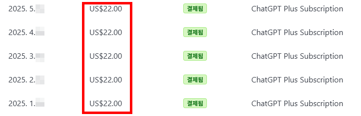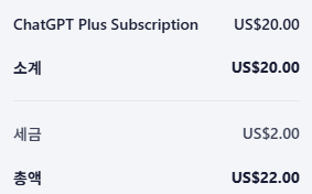 저같은 경우도 20달러 짜리 쓰고 있는데, 물론 chatGPT로 20달러 이상의 가치를 얻어내고는 있지만 좀 더 저렴하면 좋겠다고 생각하는게 사람 마음인것 같네요. 세금까지 해서 총 22달러가 매월 결제됩니다.