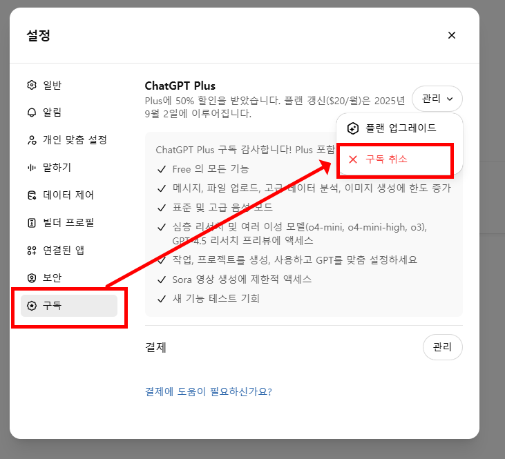 ✅ 구독 관리 또는 ‘Cancel Plan(구독 취소)’ 버튼을 누릅니다.