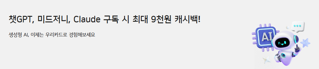 우리카드는 ChatGPT, 미드저니, 클로드(Claude) 등 3대 AI 구독 서비스에 대해 각각 3,000원씩 캐시백을 제공하는 이벤트를 운영 중입니다. 이 혜택은 우리카드의 신용카드와 체크카드 모두 사용 가능하며, 최대 9,000원까지 캐시백을 받을 수 있습니다.