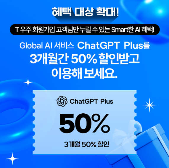 SK텔레콤이 운영하는 T우주 구독 플랫폼에서는, 통신사와 관계없이 누구나 ChatGPT Plus 요금제를 3개월간 50% 할인된 가격에 이용할 수 있는 이벤트를 운영하고 있습니다. >> 이벤트 바로 가기 >>