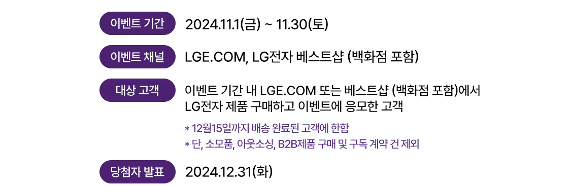 LG전자는 코리아 세일 페스타 기간 동안 추가적인 이벤트도 함께 진행합니다. 일정 금액 이상 구매한 고객을 대상으로 LG전자 인기 가전을 경품으로 제공하는 추첨 이벤트를 실시하며, 스탠바이미 TV, 스타일러, 가습기, 공기청정기 등의 다양한 사은품이 준비되어 있어, 가전제품을 구매하고 경품 혜택까지 받을 수 있는 기회가 주어집니다.